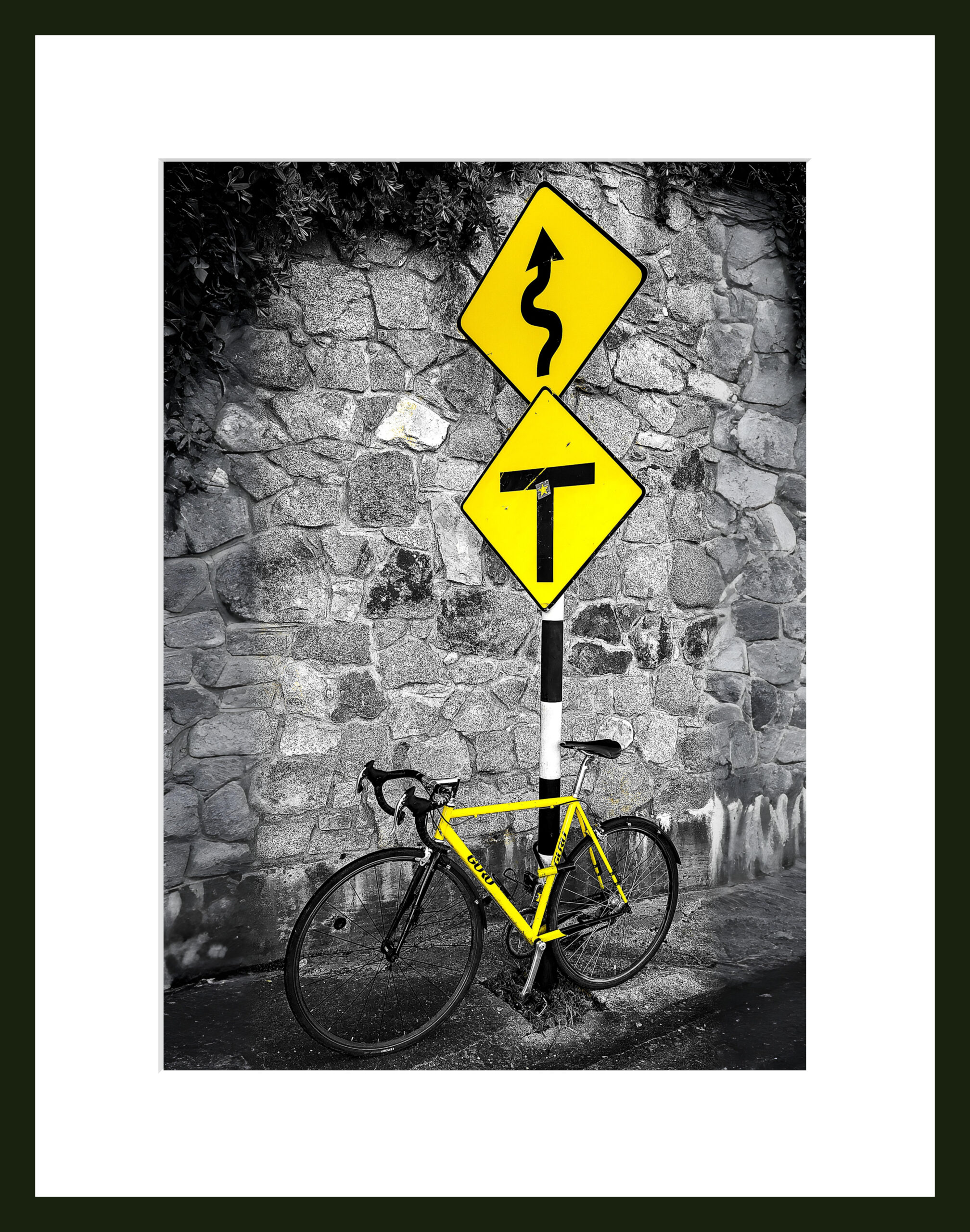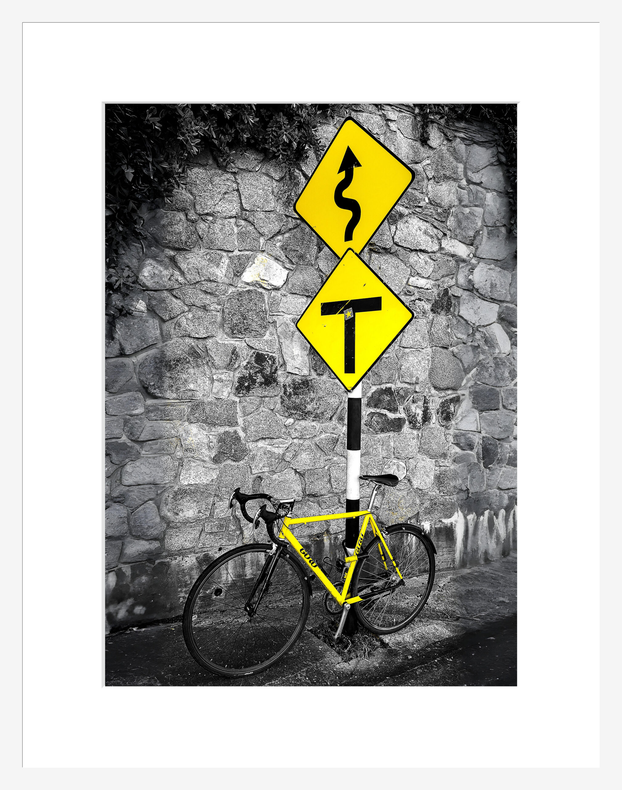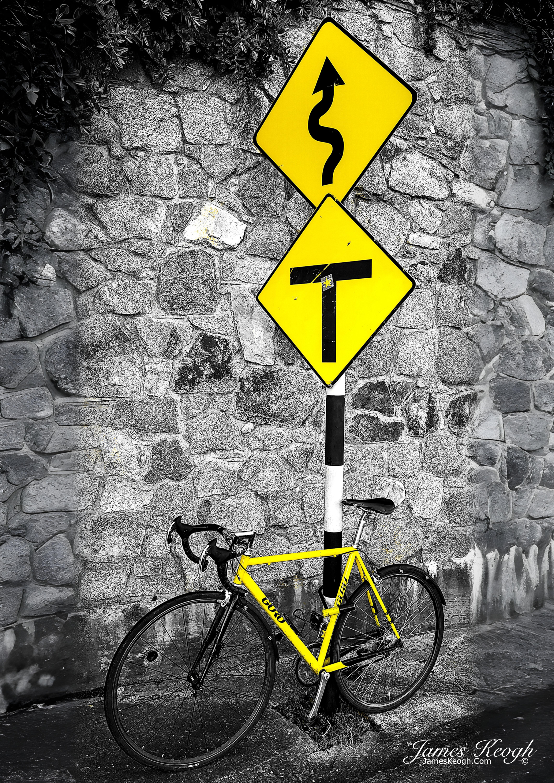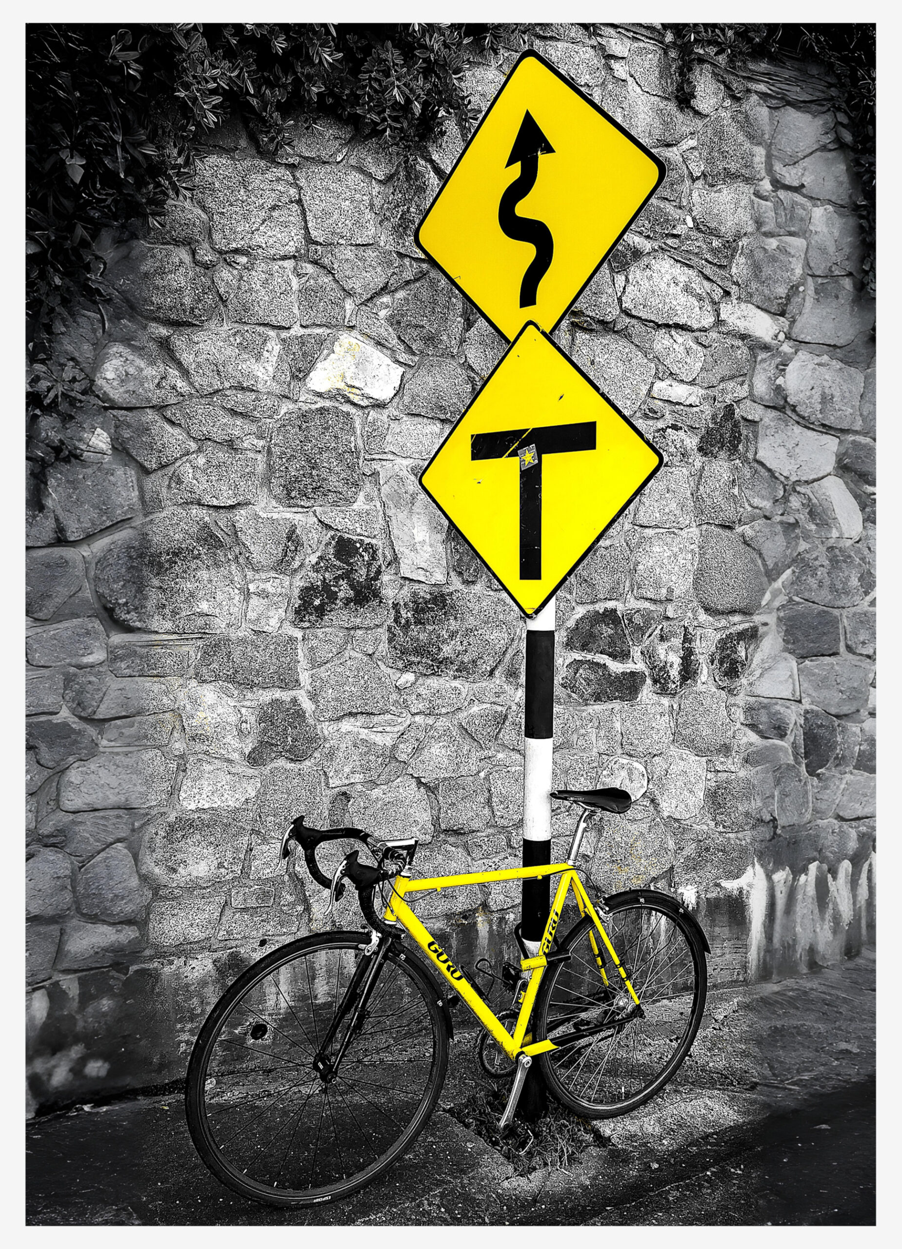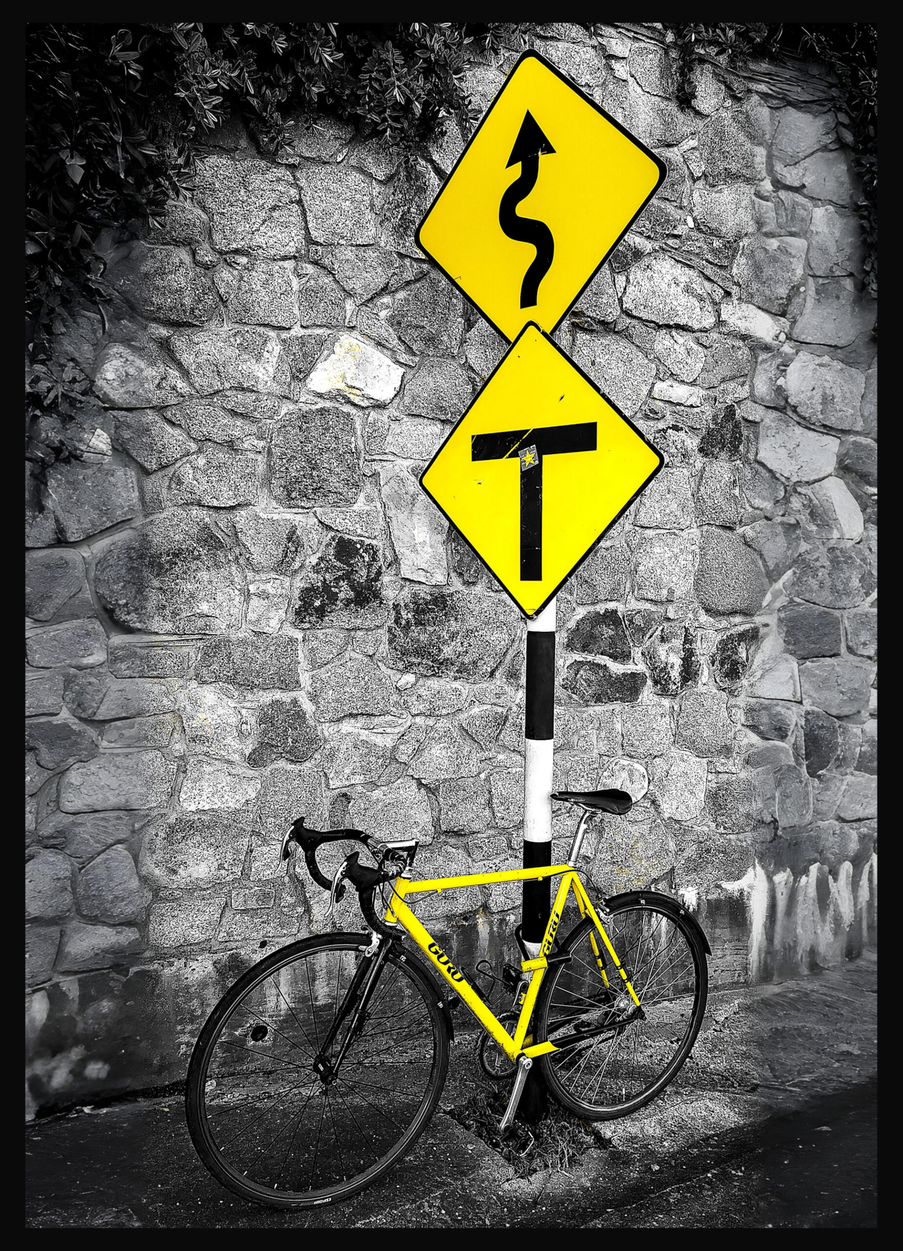 An interesting composition of the yellow bike and the road signs