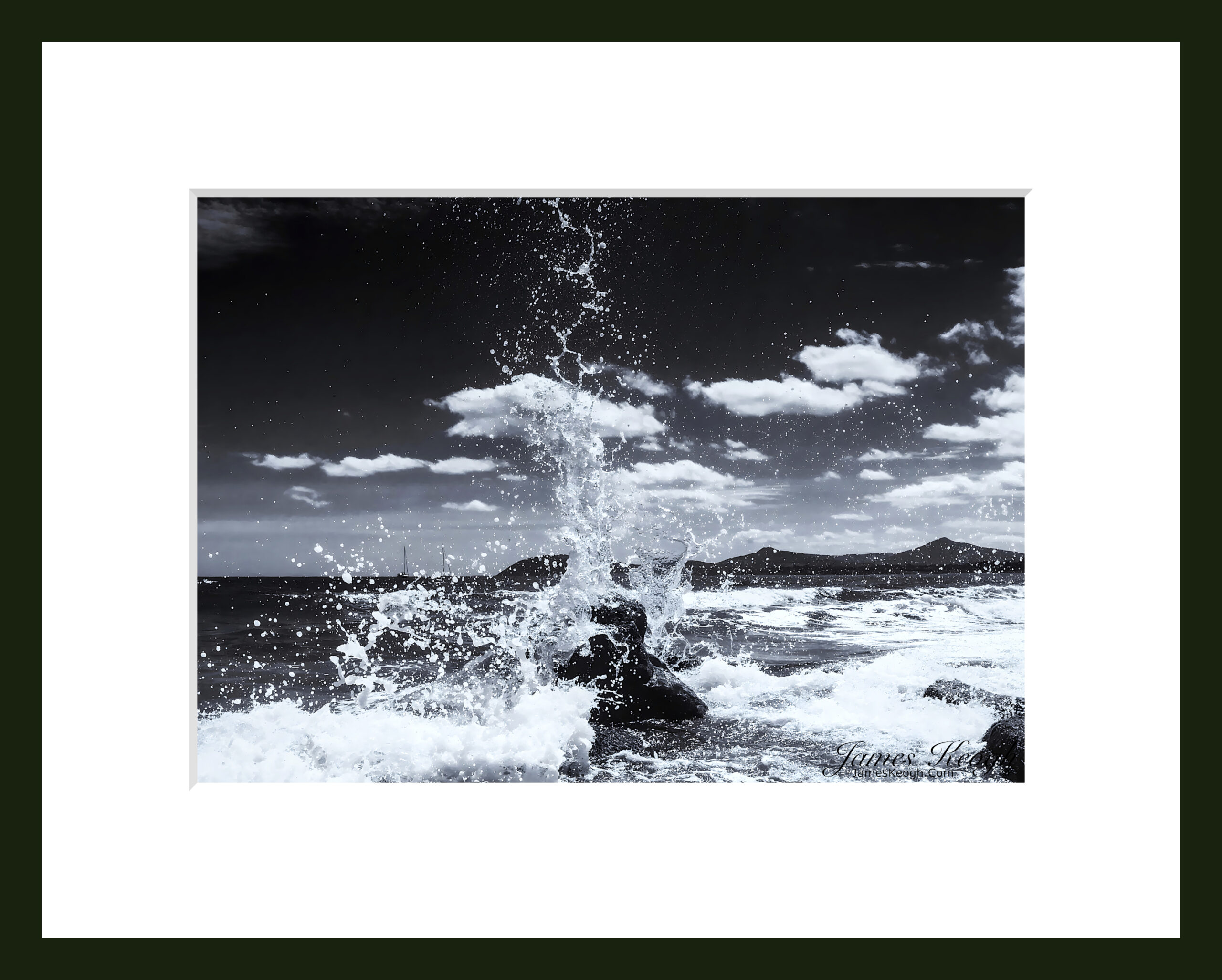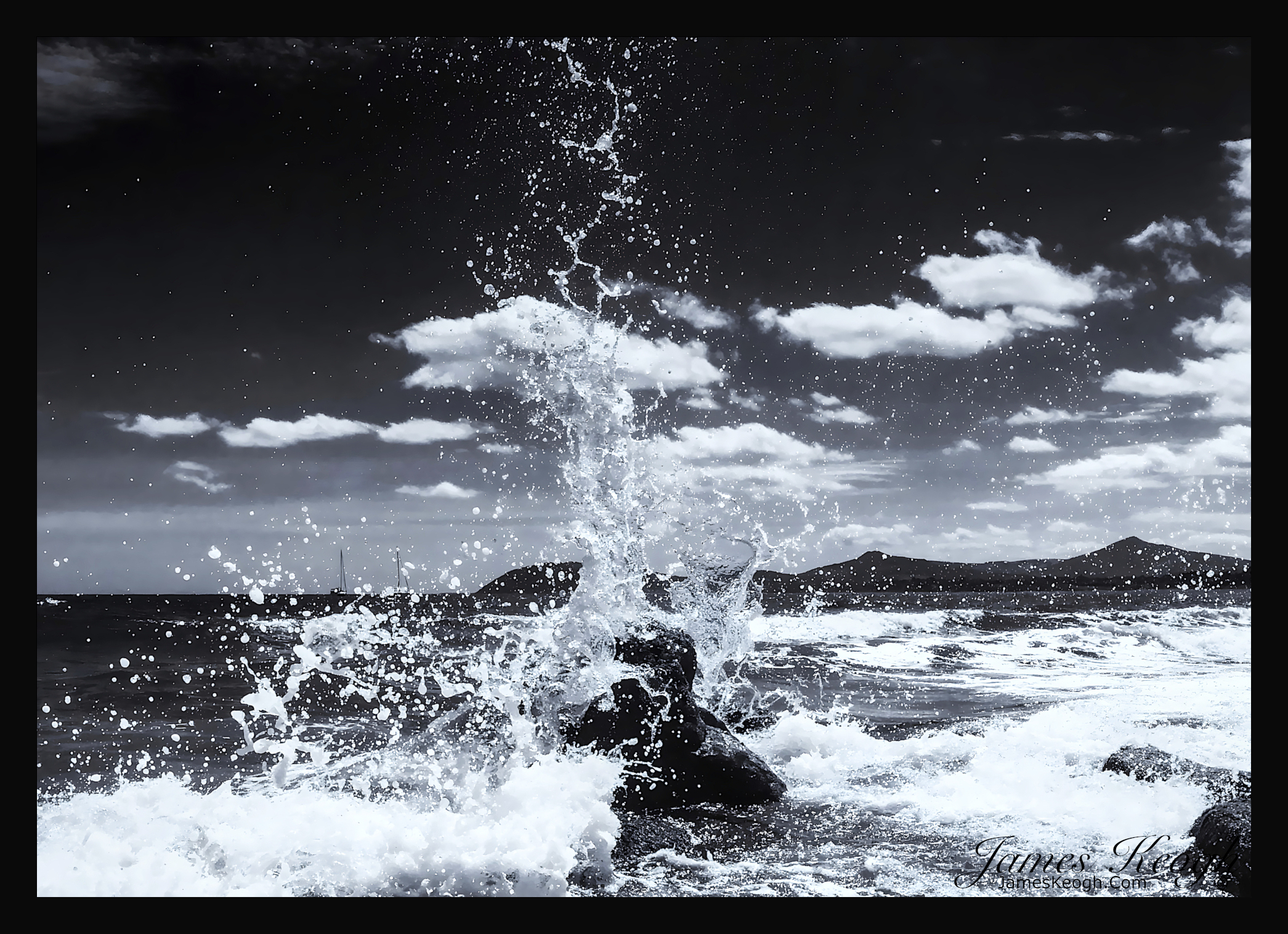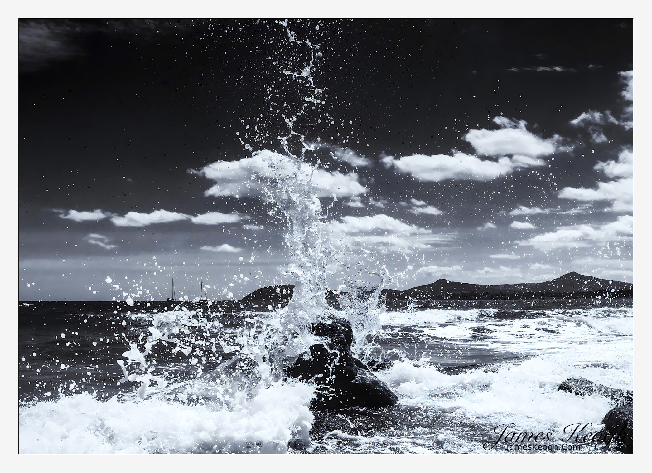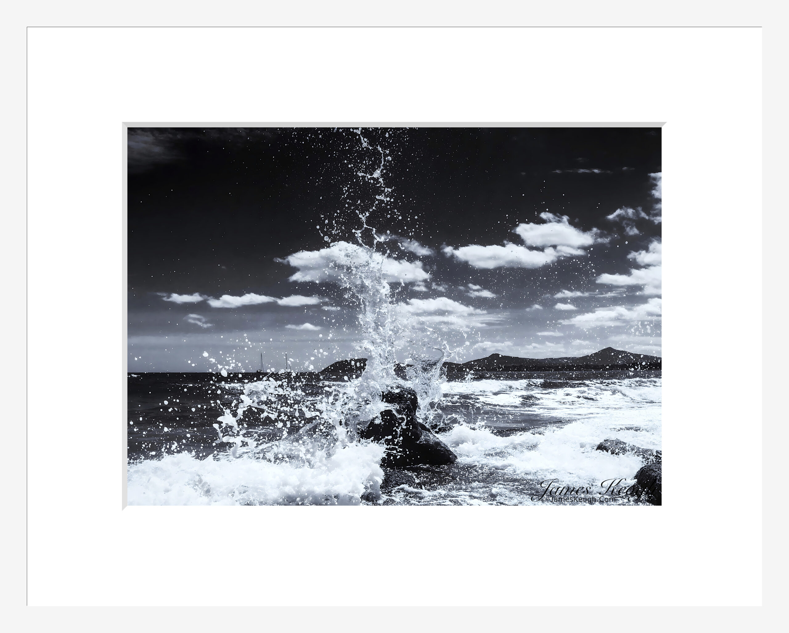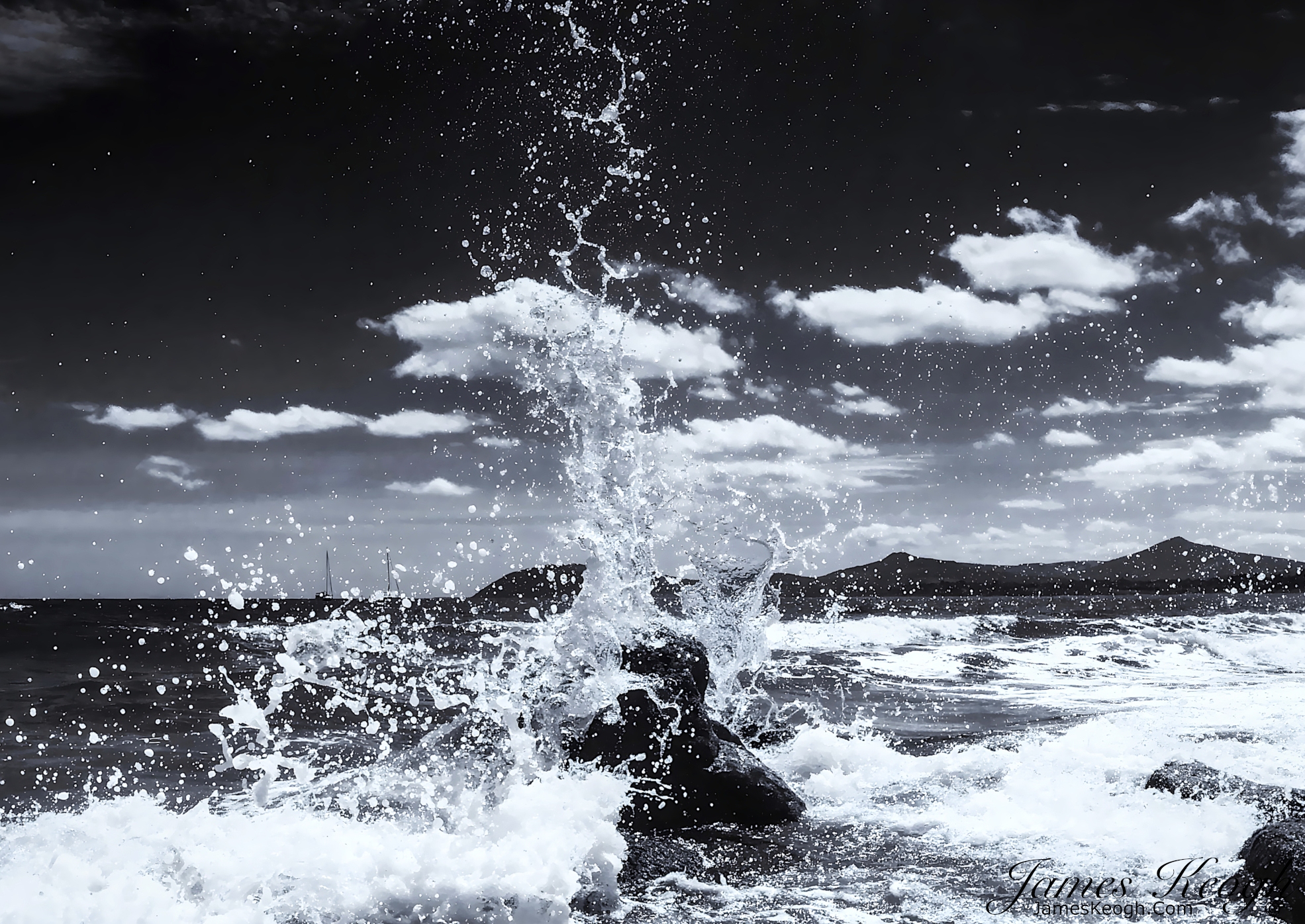 A geyser of spray day on Whiterock beach, Vico road, Dalkey, looking towards Sugarloafs.